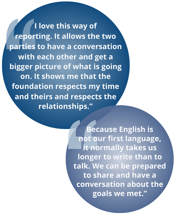 Since 2021, our practice at the VNAF has been to eliminate written grant reports and simply schedule 30-minute Zoom conversations with all of our nonprofit partners once a year, toward the end of the grant period. We recognize that our nonprofit partners are busy and that paperwork is often the last thing they have time to do. In these conversations, we welcome the participation of anyone involved in the project/organization, from Executive Directors to Development officers and Program Staff or Volunteers. The VNAF often involves our Board members in the conversations as well, to enhance the person-to-person understanding. Our goal for these reporting sessions is to listen to where our partners are, where they are heading, trends on their horizon, and not to focus just on grant outcomes. We also use these conversations as an opportunity for both grantor and grantee to share feedback and ask questions, or to make suggestions regarding potential partners or other funders who might be interested in the work. We are heartened to see that these reporting conversations have been tremendously well-received by our grantee partners.